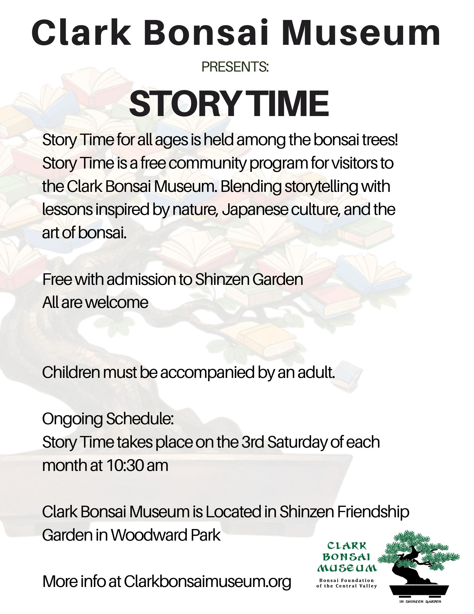 Story Time is a free community program for visitors to the Clark Bonsai Museum. Held among living bonsai, each session blends storytelling with lessons inspired by nature, Japanese culture, and the art of bonsai. Gathered in a space that nurtures patience, curiosity, and imagination, children and families are invited to slow down, listen deeply, and connect with the natural world.