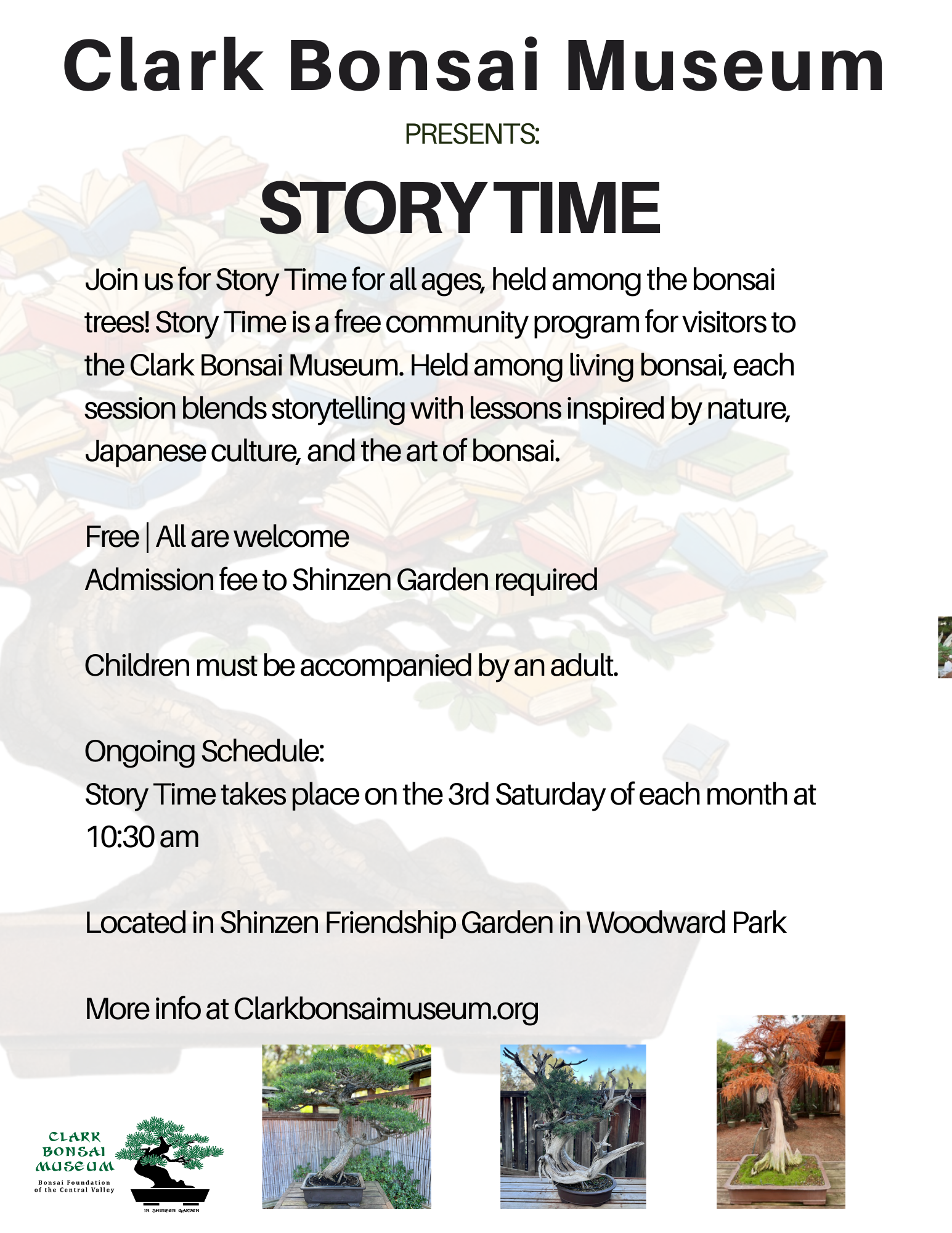 Shinzen Japanese Garden @ Woodward Park 7775 N Friant Rd, Fresno, CA, United StatesStory Time in the Bonsai Garden Join us for Story Time for all ages, held among the bonsai trees! We’re excited to welcome Bob Hilvers, our Head Curator, as our…
